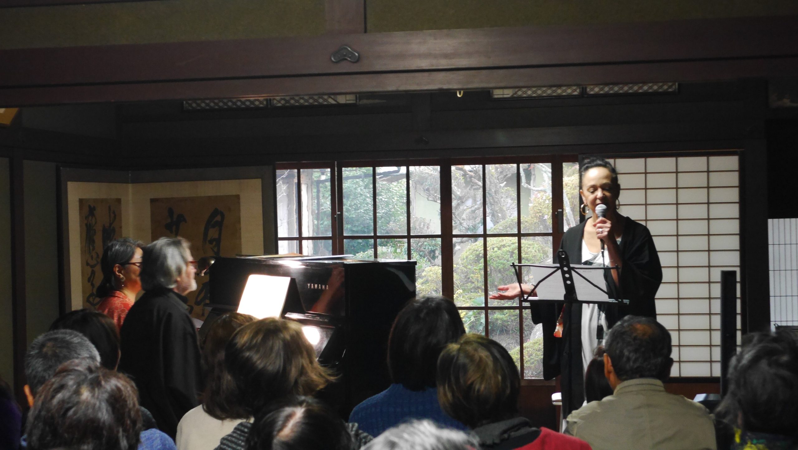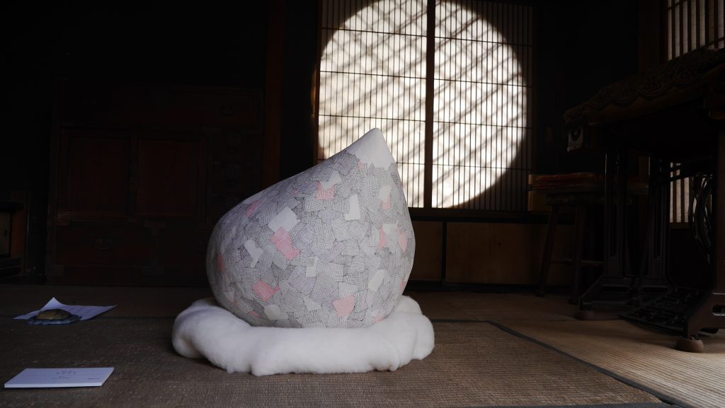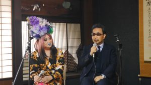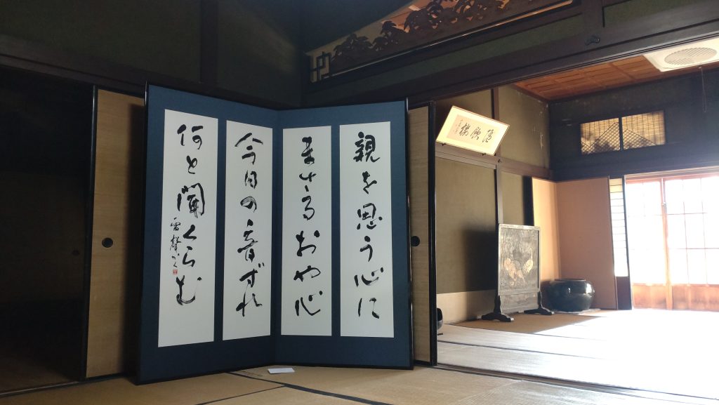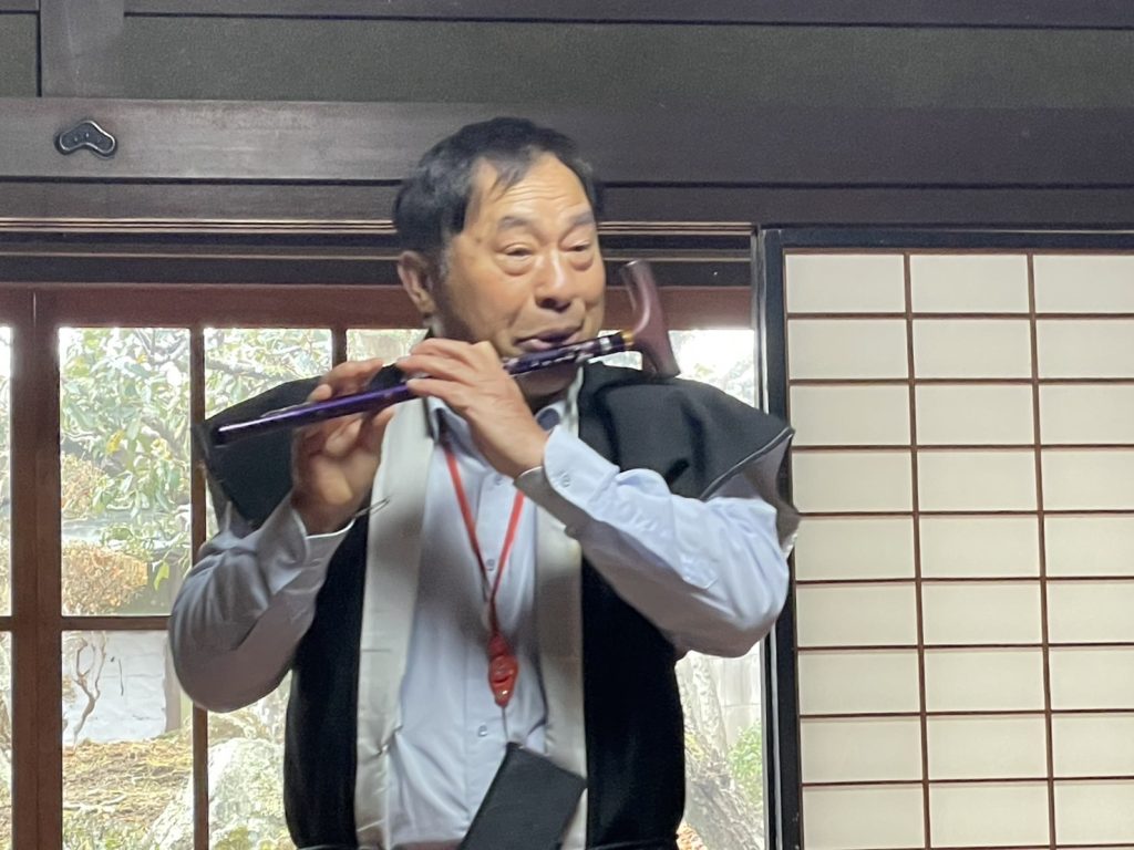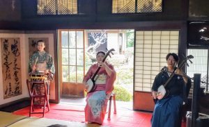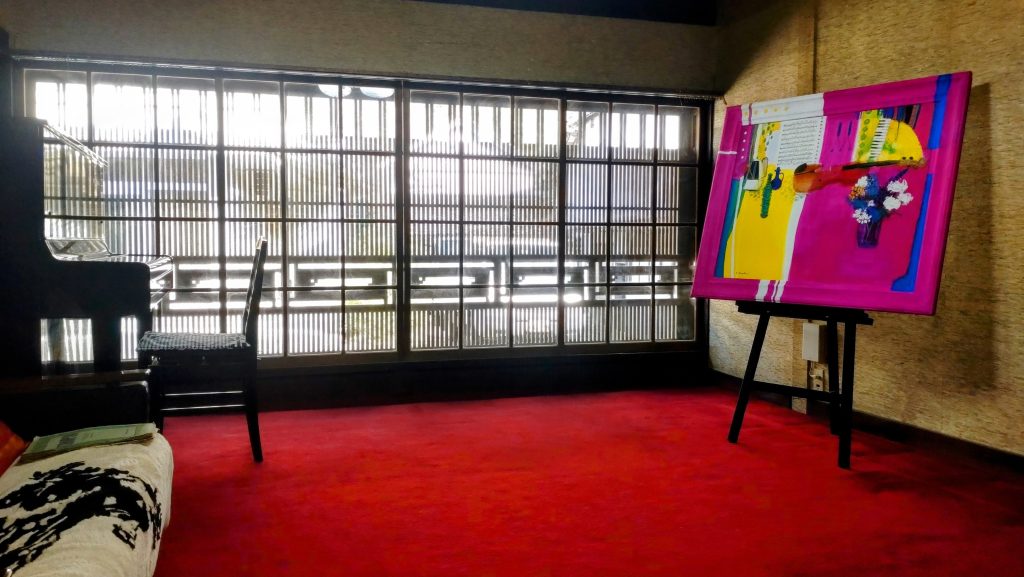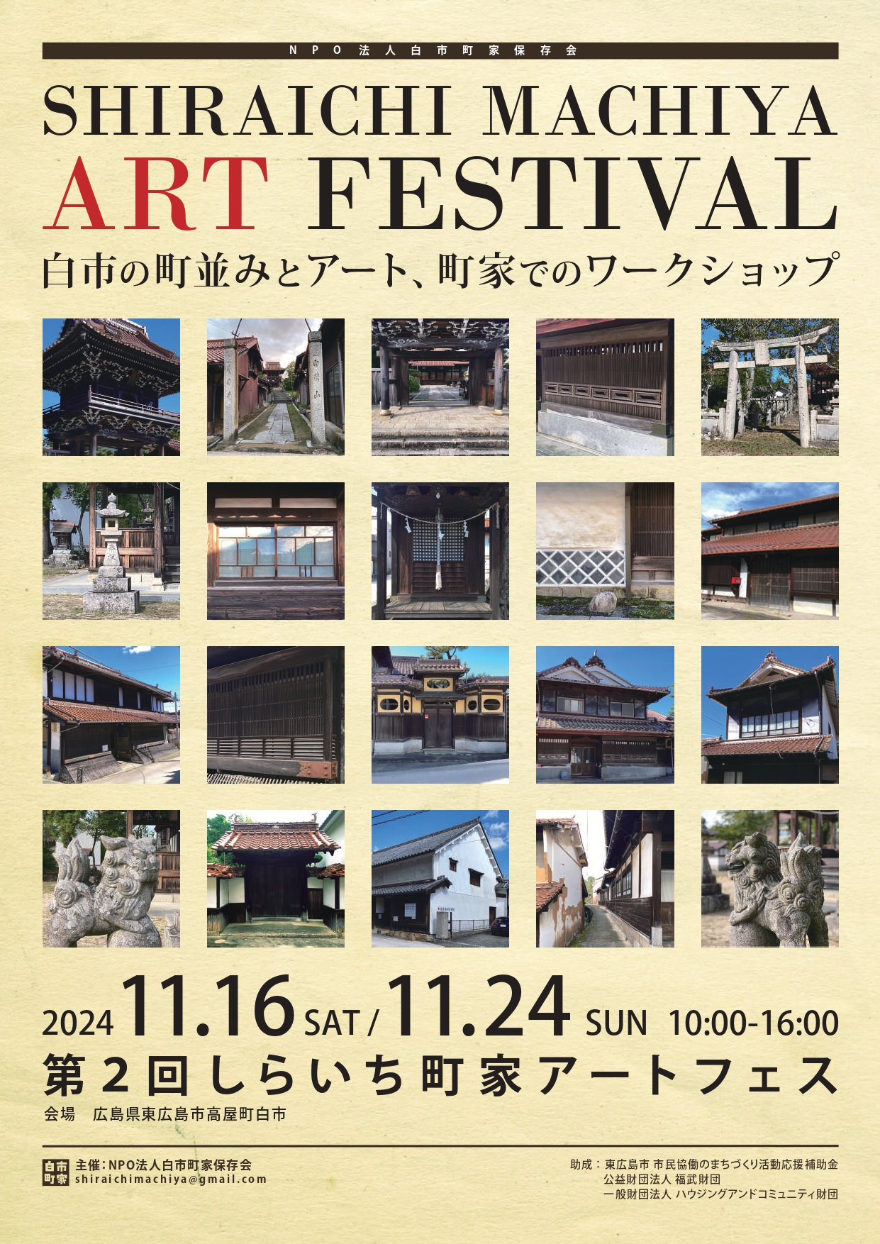 しらいち町家アートフェス2024年11月16日~24日、江戸、明治、大正、昭和初期の町家・文化財施設とアート作品のコラボ、「白市町家美術館」が開催され、伊原正三家住宅にも作品が展示されました。この期間、NPO法人白市町家保存会が主催した「しらいち町家アートフェス」では、広島県建築士会・奈良女子大学教授の藤田盟児先生による白市町歩き町家見学会と講演「白市の町家の魅力」。淡交会東広島青年部によるお茶会、竹山流津軽三味線・田岡隷山社中の演奏会、フランス・ボルドー在住の音楽家3人による演奏会。アーティストのヴィヴィアン佐藤さんのオーラ似顔絵、ヘッドドレスのワークショップ、松田弘東広島市立美術館館長とのトークイベントなど、伊原正三家住宅でおこなわれました。