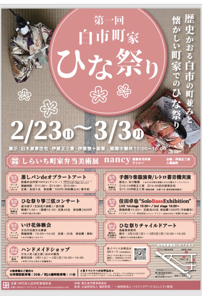 2月23日から3月3日まで開催した第1回白市町家ひな祭り。伊原正三家住宅も展示会場親子連れから年輩の方まで、また遠方からの訪問など、多くの方に楽しんでいただきました。期間中、前衛弁当作家nancyさんによる「弁当美術展」を開催。ひな人形に囲まれたお座敷を舞台に、米川繁樹さんの手創り楽器演奏、ひな祭り箏三弦コンサート、住田卓也さんの「Solo Bass Exhibition」LIVEなどがおこなわれました。